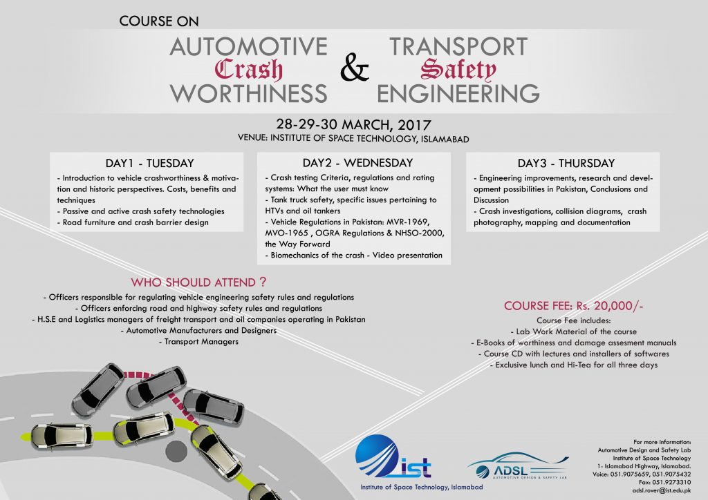 | PKR20000This training, provides an in-depth knowledge into the exciting world of crash safety engineering on passenger vehicles and HTV fleets. The trainings would cover topics of vehicle regulations and protocols, laws in Pakistan (MVR 1969, NHSO2000 & PSQCA) and discusses what developments have been done and what more can be done to implement safety in transportation in Pakistan.